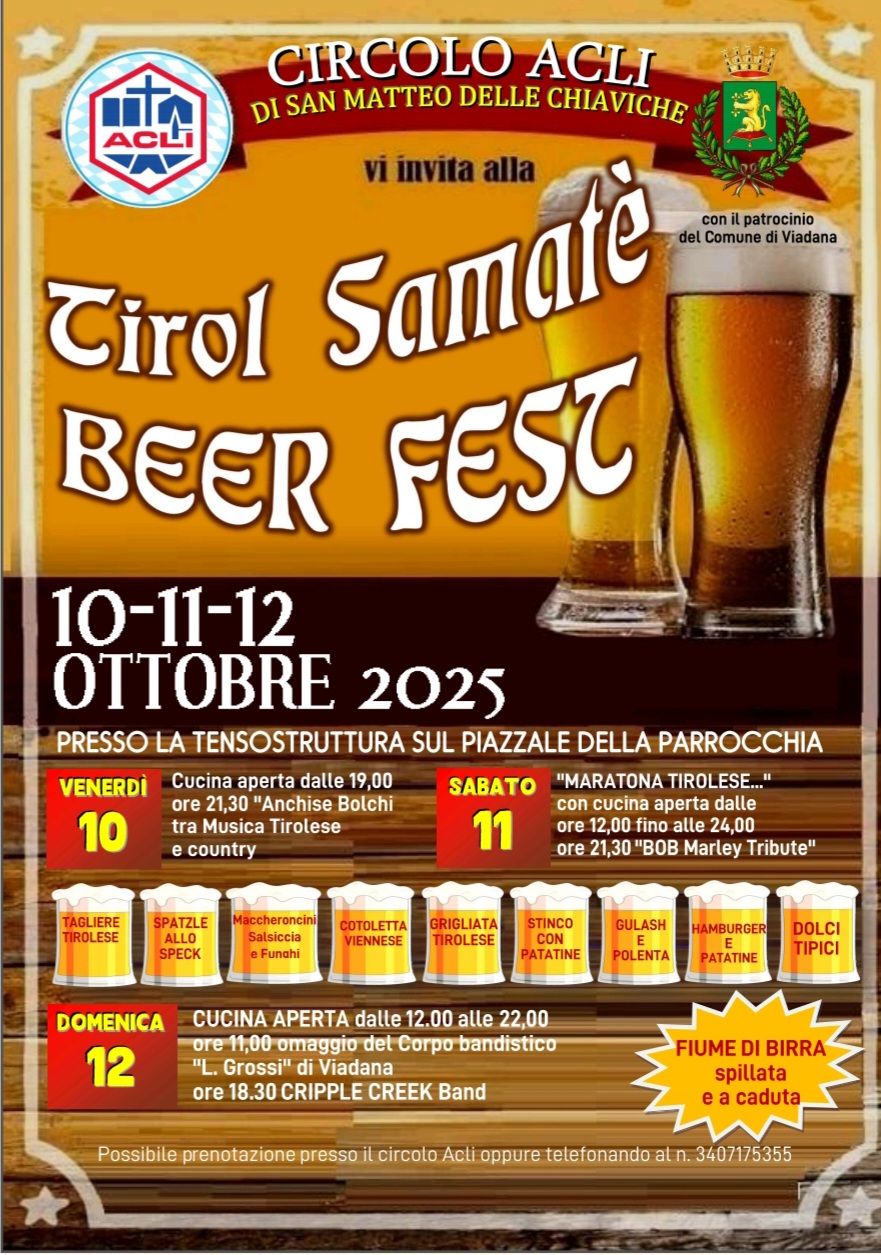 Torna la Tirol Samatè Beer Fest organizzata dall'Acli di San Matteo delle Chiaviche presso la tensostruttura nel piazzale della Parrocchia con cucina Tirolese, Birra e Musica.