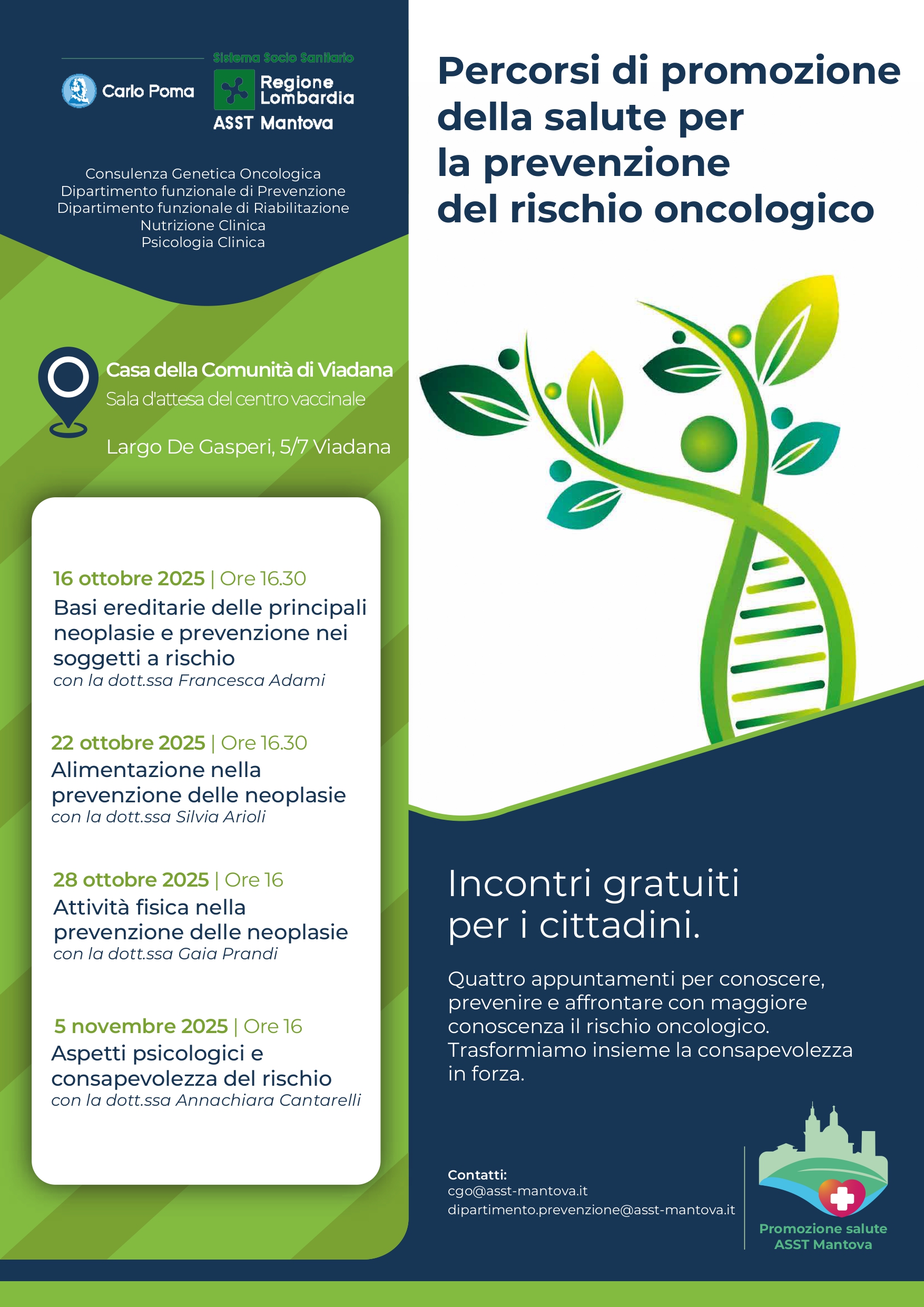 Percorsi di promozione della salute per la prevenzione del rischio oncologico - Incontri gratuiti per i cittadini 16 - 22 - 28 ottobre - 5 novembre presso la Casa della Comunità di Viadana - Largo de Gasperi 5/7. Quattro appuntamenti per conoscere, prevenire e affrontare con maggiore conoscenza il rischio oncologico e trasformare la consapevolezza in forza.