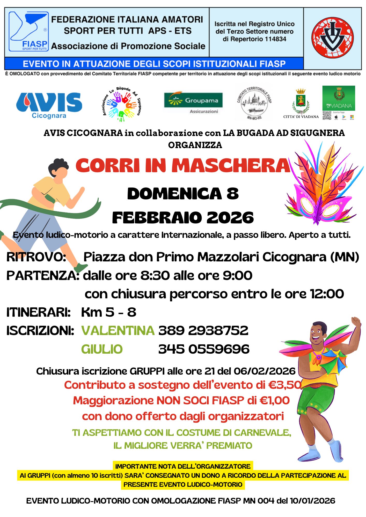 Domenica 8 febbraio - Corri in maschera - 2 ^ edizione. Ritrovo in Piazza Don Mazzolari. Iscrizioni dalle 8,30 alle 9.00. Chiusura percorso ore 12.00